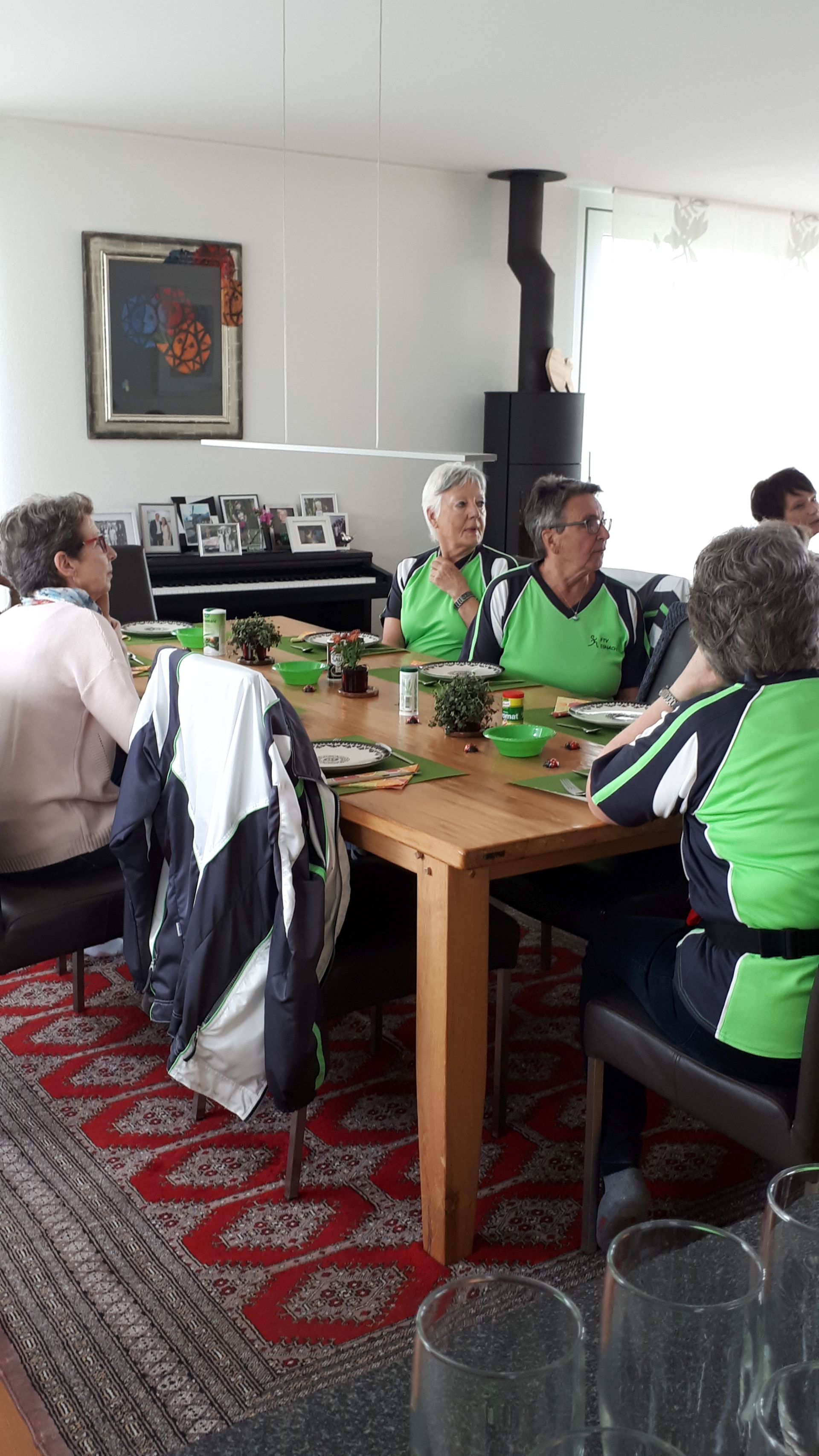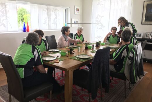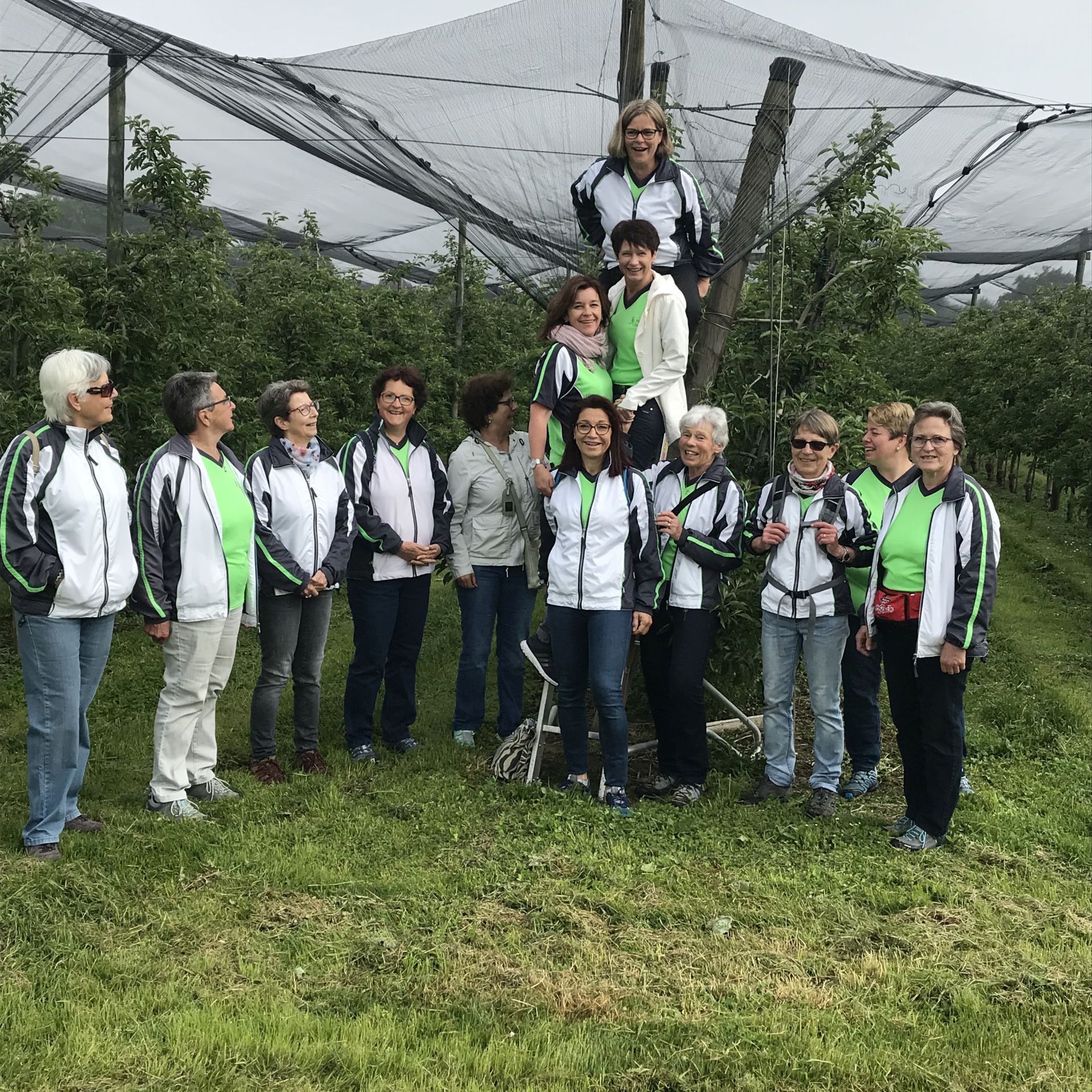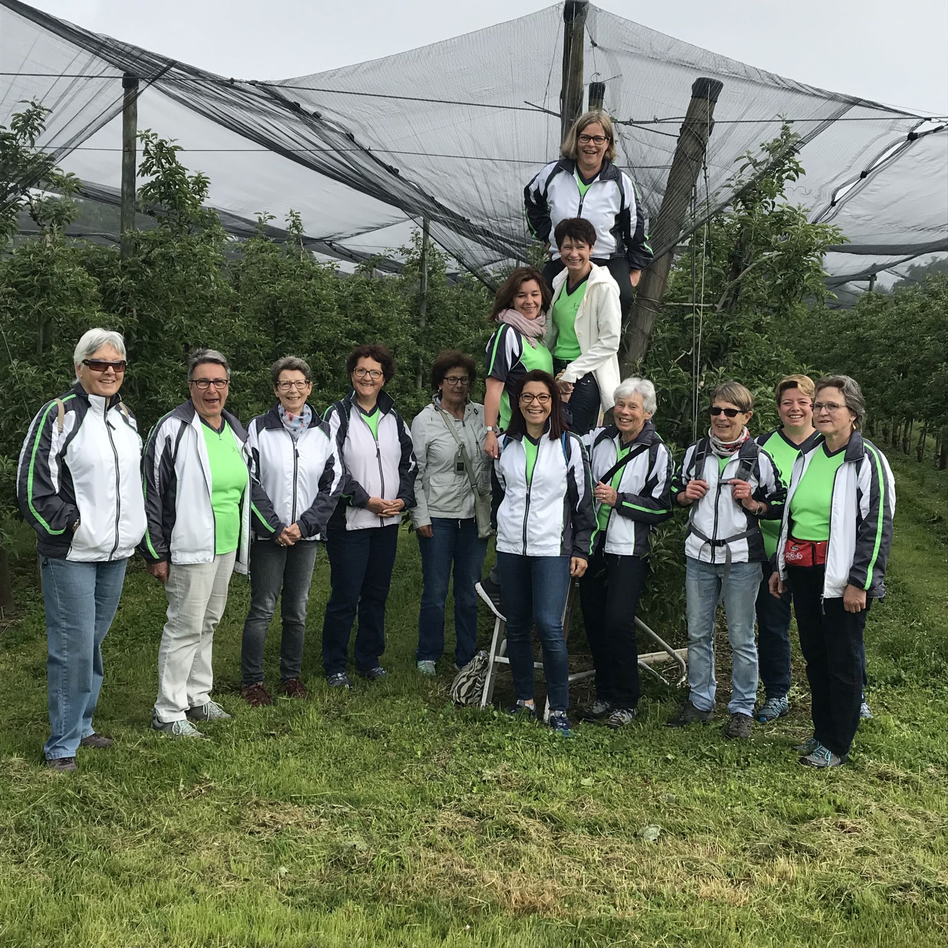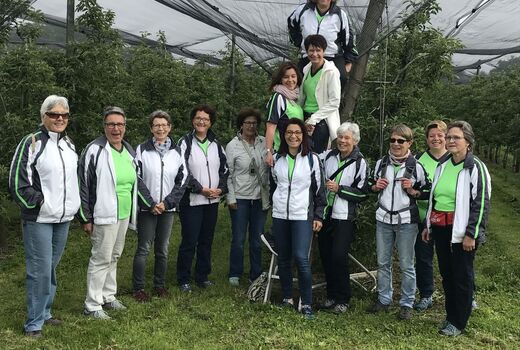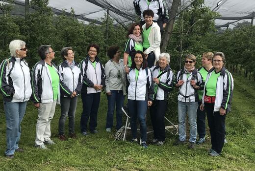 Nach einem kurzen Fotostopp inmitten der Obstplantagen ging es wieder zurück ins Dorf und endlich kam auch die Sonne um Vorschein. Zur grossen Überraschung aller wurde ins Haus einer Turnkollegin geladen, wo ein wunderbares Brunchbuffet auf die Wanderinnen wartete. Und später dann, im Garten, genossen die Turnerinnen noch bis spät in den Nachmittag die Sonne in geselliger Runde - Das Schöne kann so einfach sein!