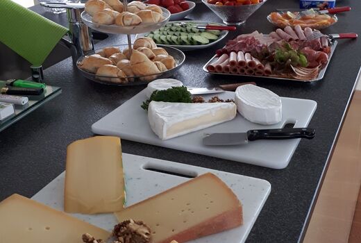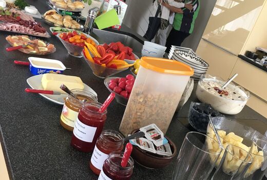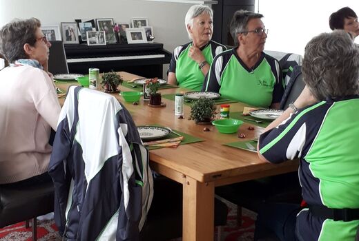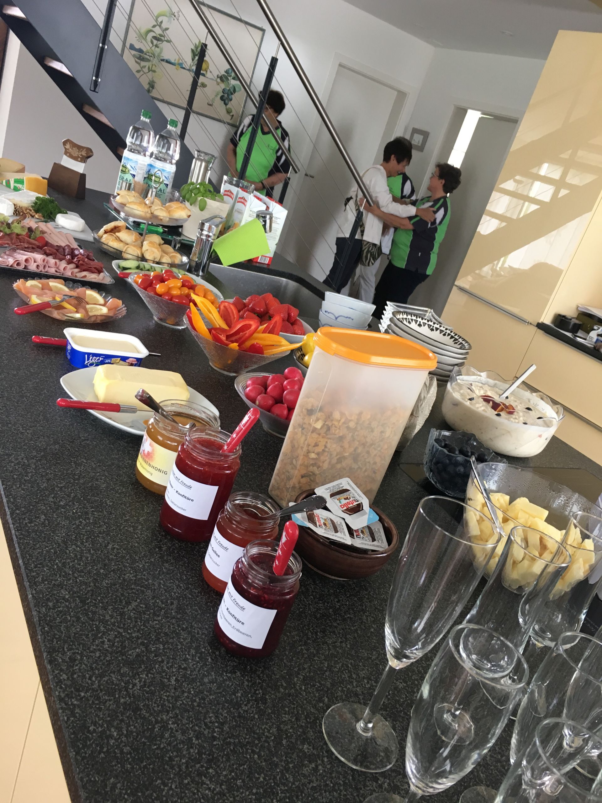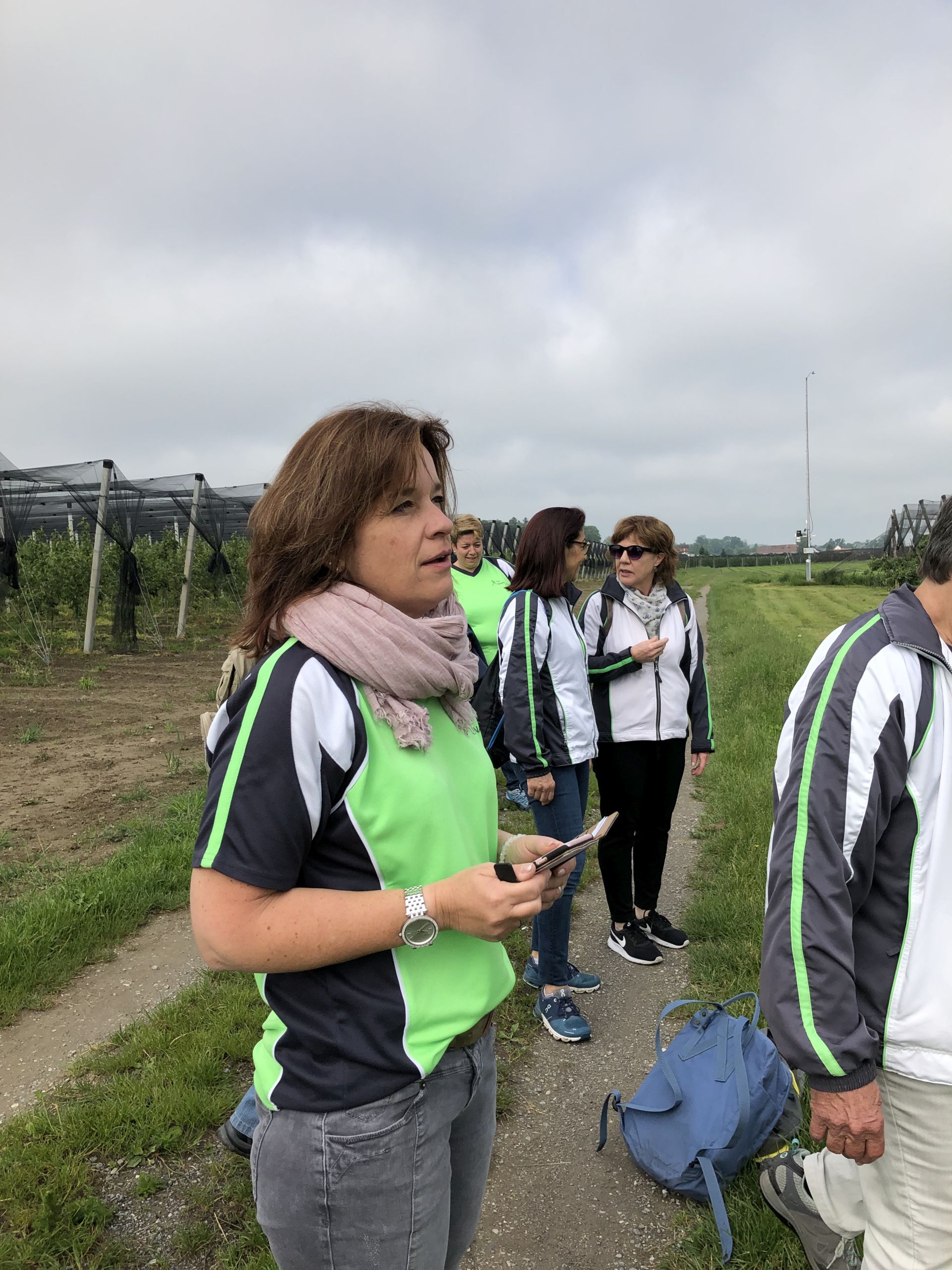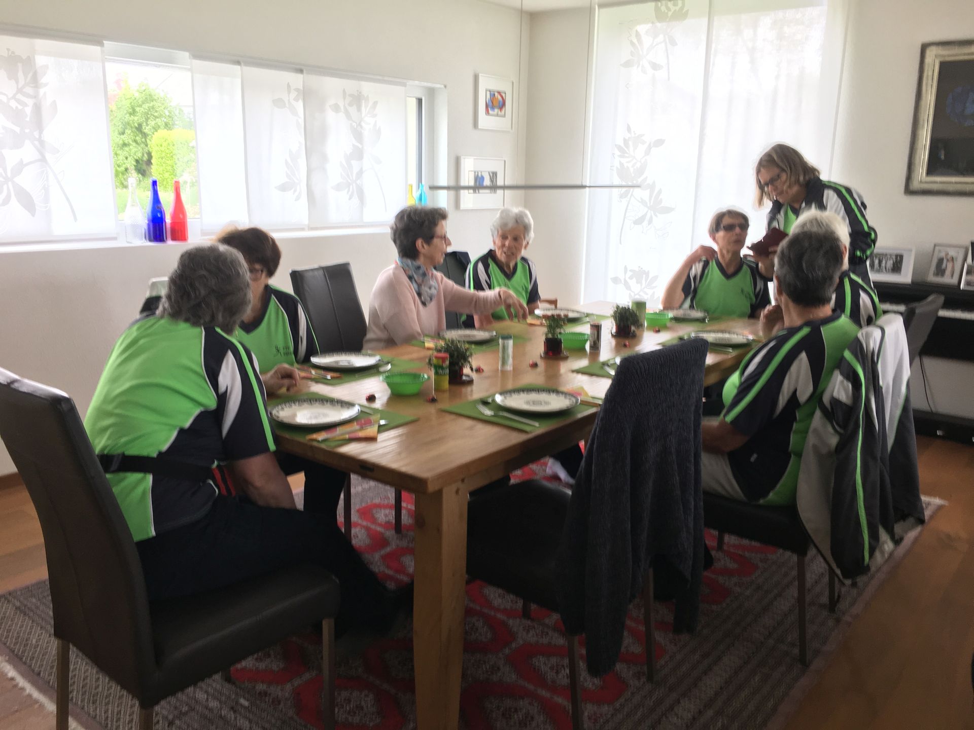Nach einem kurzen Fotostopp inmitten der Obstplantagen ging es wieder zurück ins Dorf und endlich kam auch die Sonne um Vorschein. Zur grossen Überraschung aller wurde ins Haus einer Turnkollegin geladen, wo ein wunderbares Brunchbuffet auf die Wanderinnen wartete. Und später dann, im Garten, genossen die Turnerinnen noch bis spät in den Nachmittag die Sonne in geselliger Runde - Das Schöne kann so einfach sein!