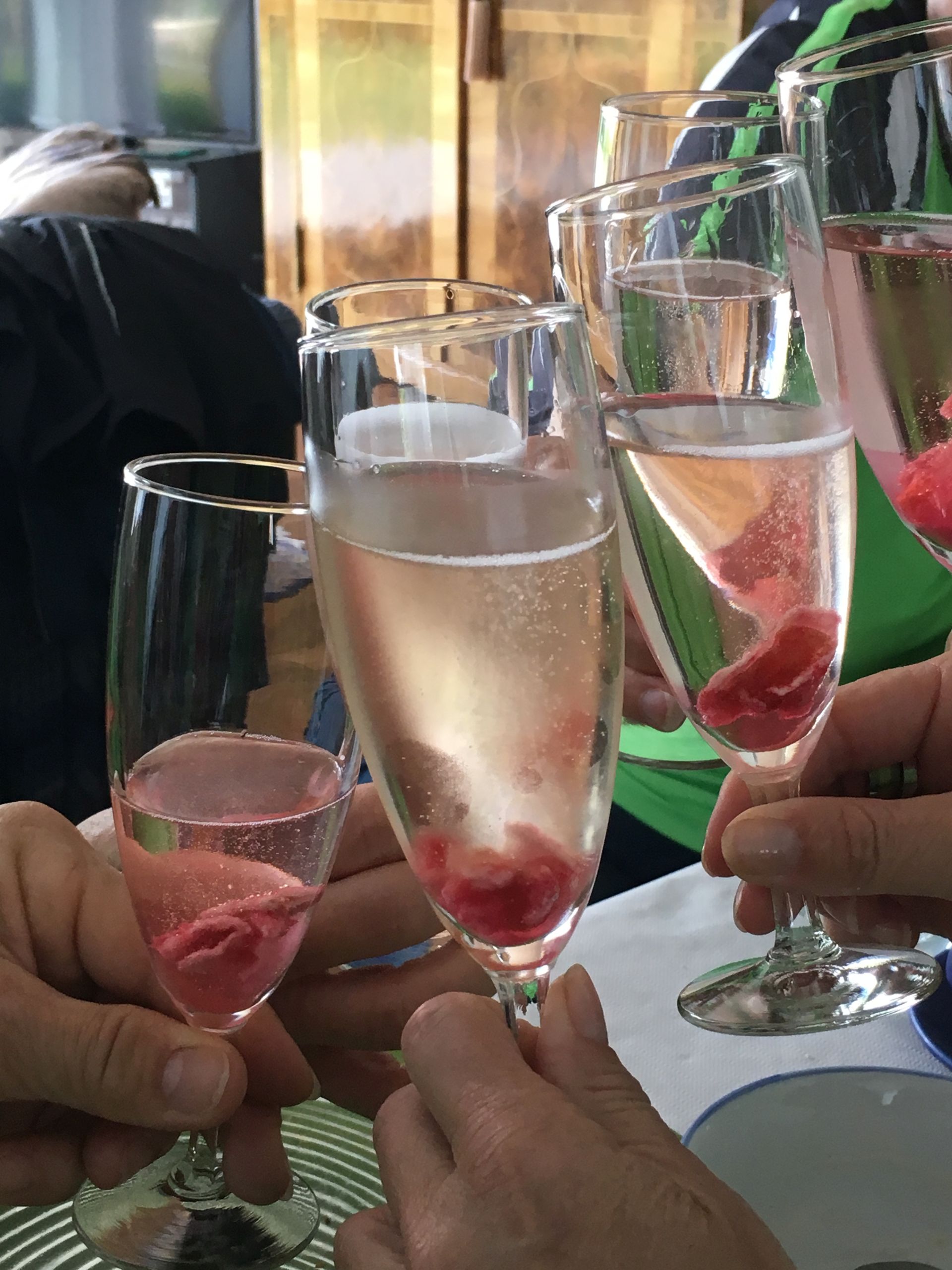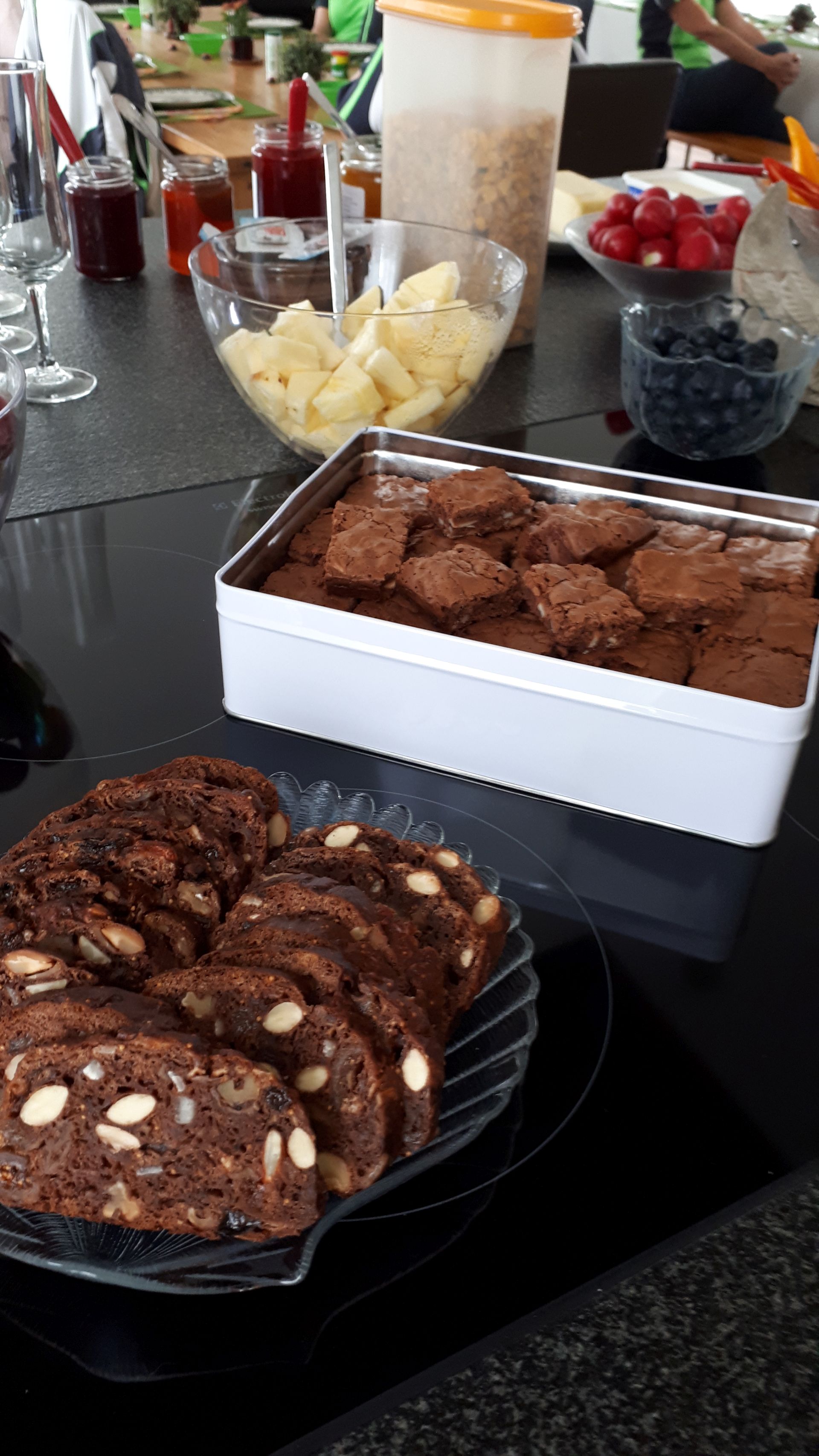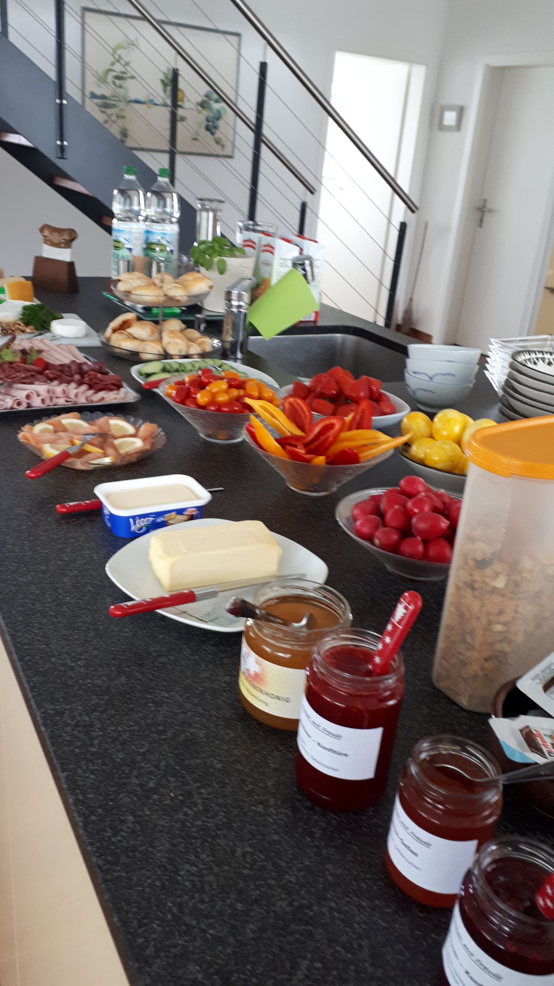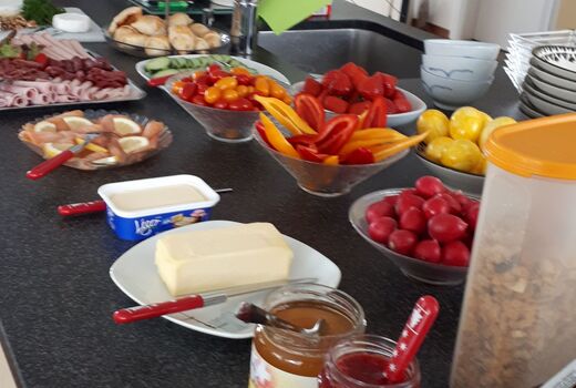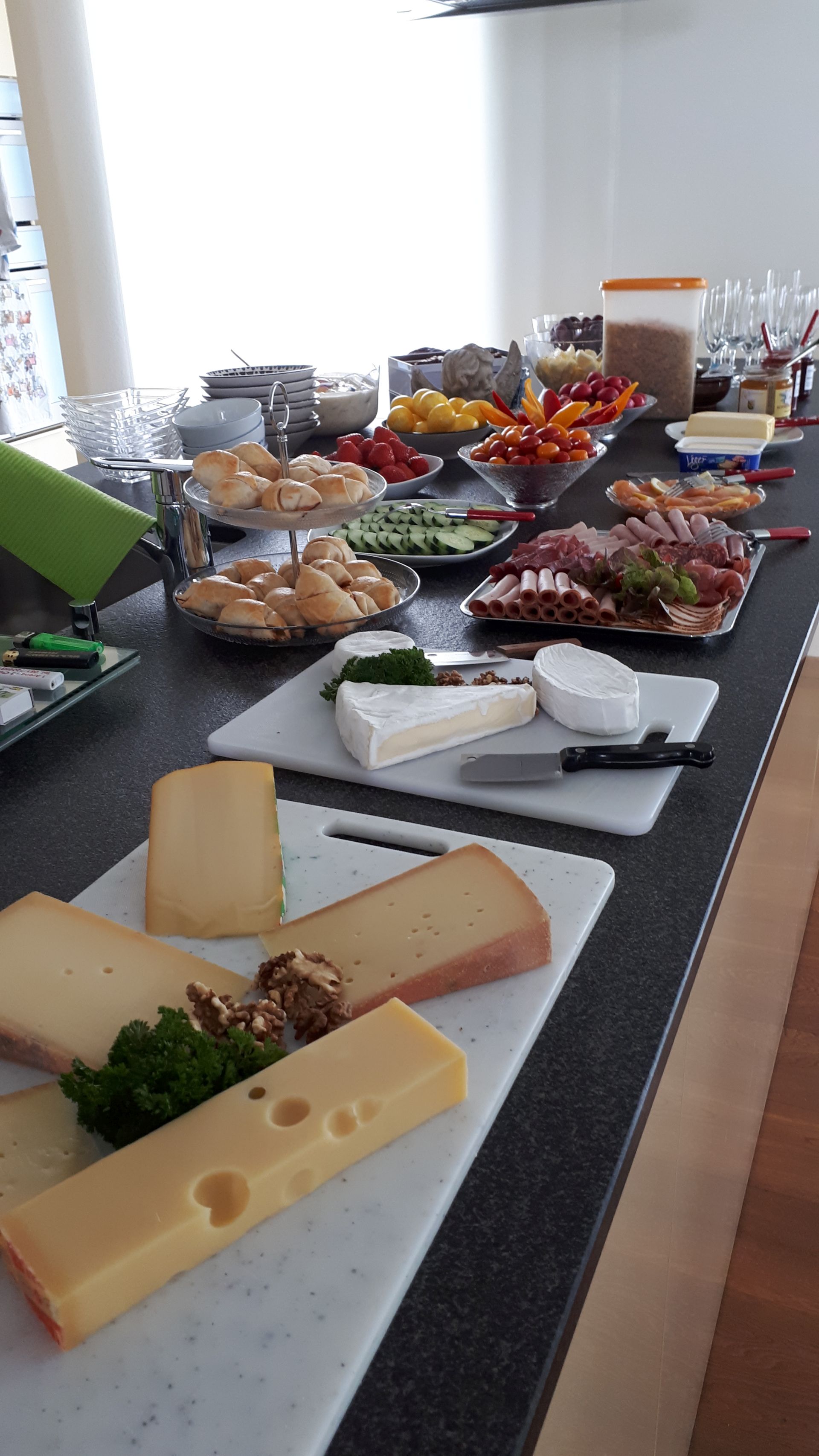 Nach einem kurzen Fotostopp inmitten der Obstplantagen ging es wieder zurück ins Dorf und endlich kam auch die Sonne um Vorschein. Zur grossen Überraschung aller wurde ins Haus einer Turnkollegin geladen, wo ein wunderbares Brunchbuffet auf die Wanderinnen wartete. Und später dann, im Garten, genossen die Turnerinnen noch bis spät in den Nachmittag die Sonne in geselliger Runde - Das Schöne kann so einfach sein!